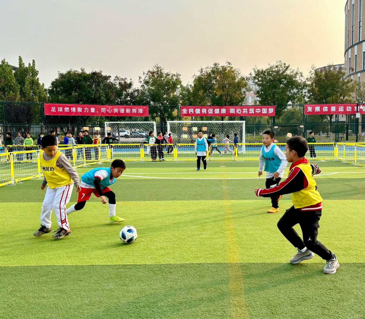北京师范大学实验小学学生在踢球。(新华社发) 许多受访家长反映,周末和节假日,孩子更主动锻炼了,还总拉上父母一起。数据印证了变化:以北师大实验小学为例,学生的体测优良率已提升至95%,较2021年增长了9个百分点。