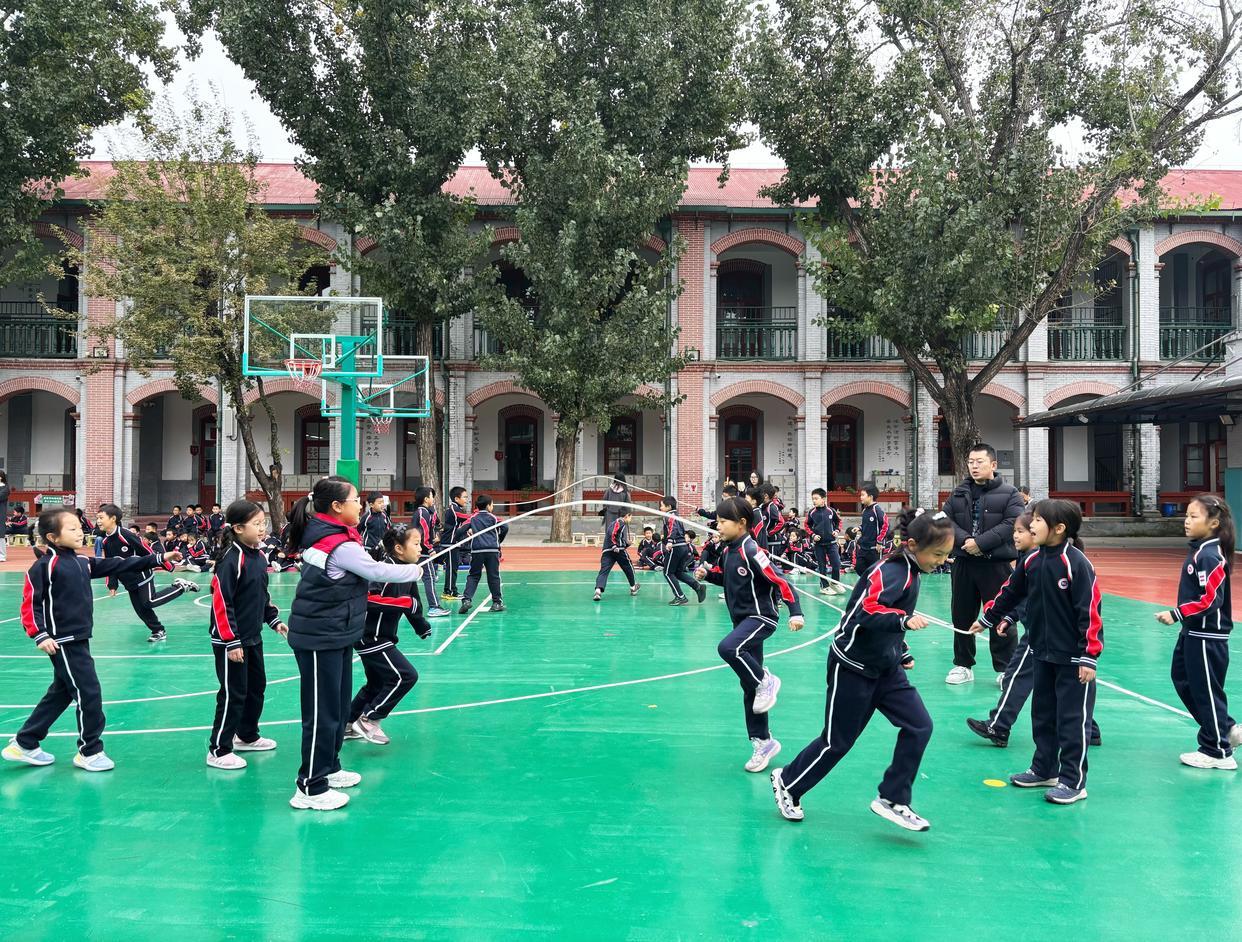 京华实验学校学生参加跳绳比赛。新华社记者 赵旭 摄 在黄城根小学,学生们赛前为班级创作手绘海报,赛后开展“理智观赛与激情释放”主题辩论,美育、德育得以自然地融入体育。