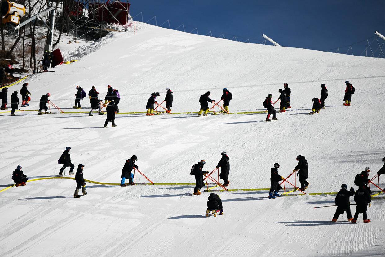 2022年1月28日,工作人员在国家高山滑雪中心雪道上进行冰状雪制作。新华社记者 张晨霖 摄目前米兰冬奥会的参赛名额竞争