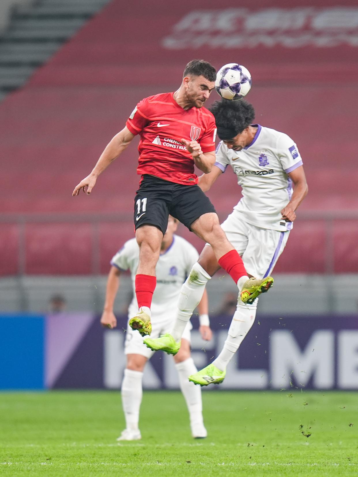 11月25日,成都蓉城队球员古尔芬克尔(左)在比赛中争顶头球。新华社记者 王曦 摄