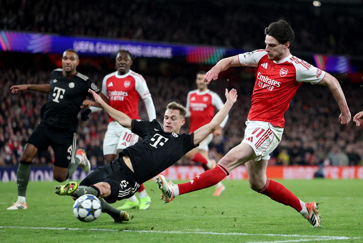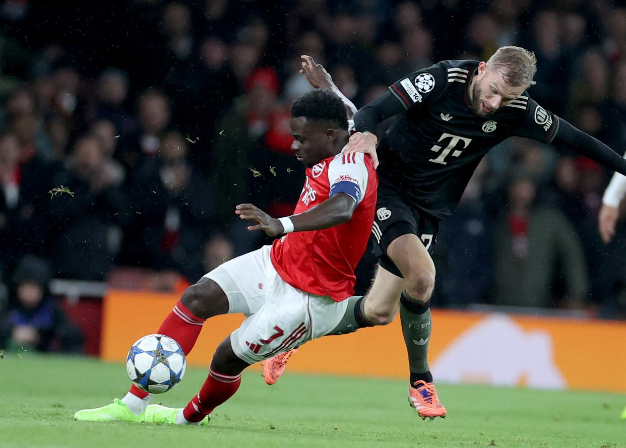 11月26日,阿森纳队球员萨卡(左)与拜仁慕尼黑队球员莱默尔拼抢。新华社记者李颖摄