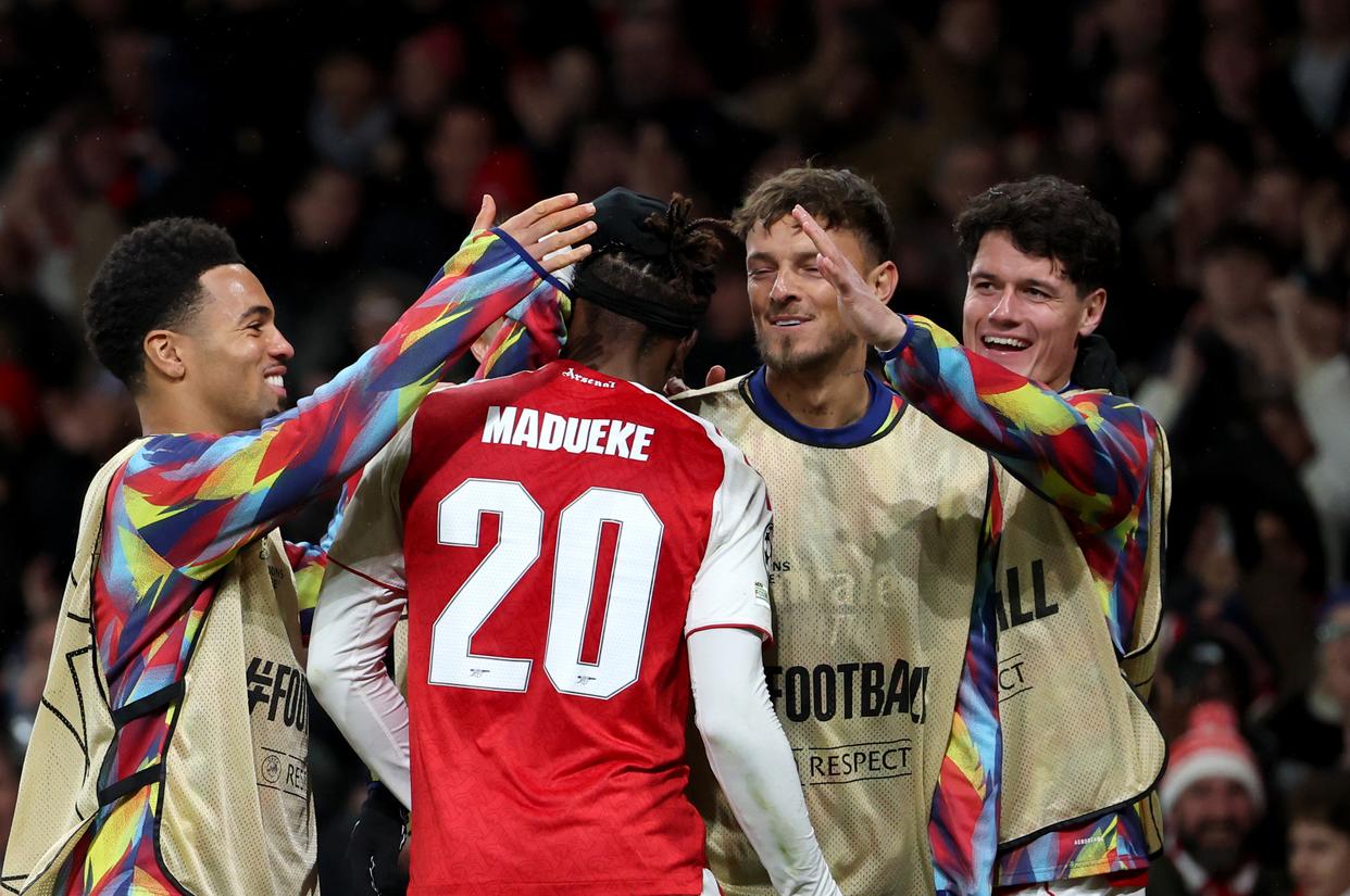 11月26日,阿森纳队球员马杜埃凯(左二)进球后与队友庆祝。新华社记者李颖摄