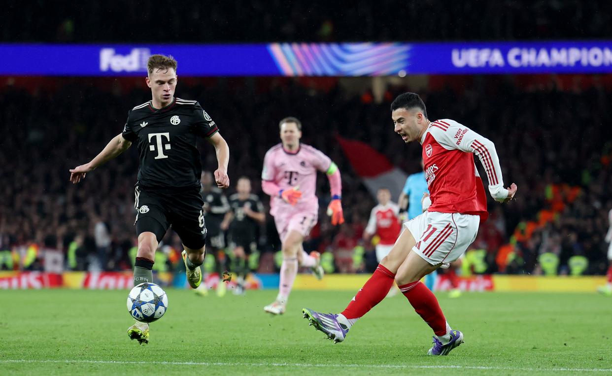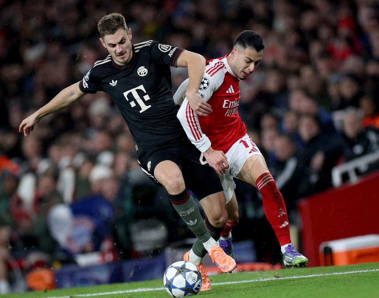 11月26日,阿森纳队球员马丁内利(右)与拜仁慕尼黑队球员斯塔尼希奇拼抢。新华社记者李颖摄
