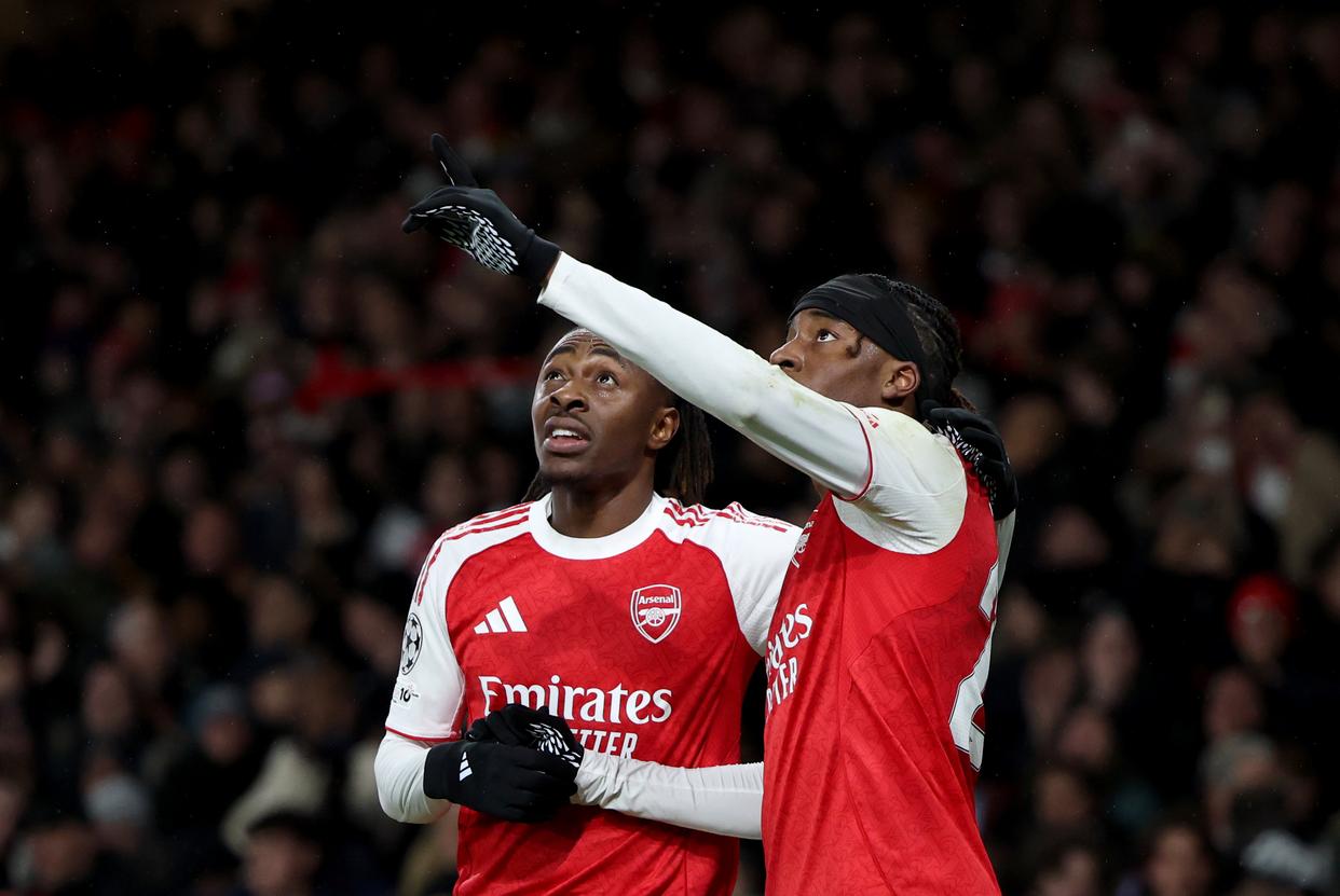 11月26日,阿森纳队球员马杜埃凯(右)进球后与队友埃泽庆祝。新华社记者李颖摄