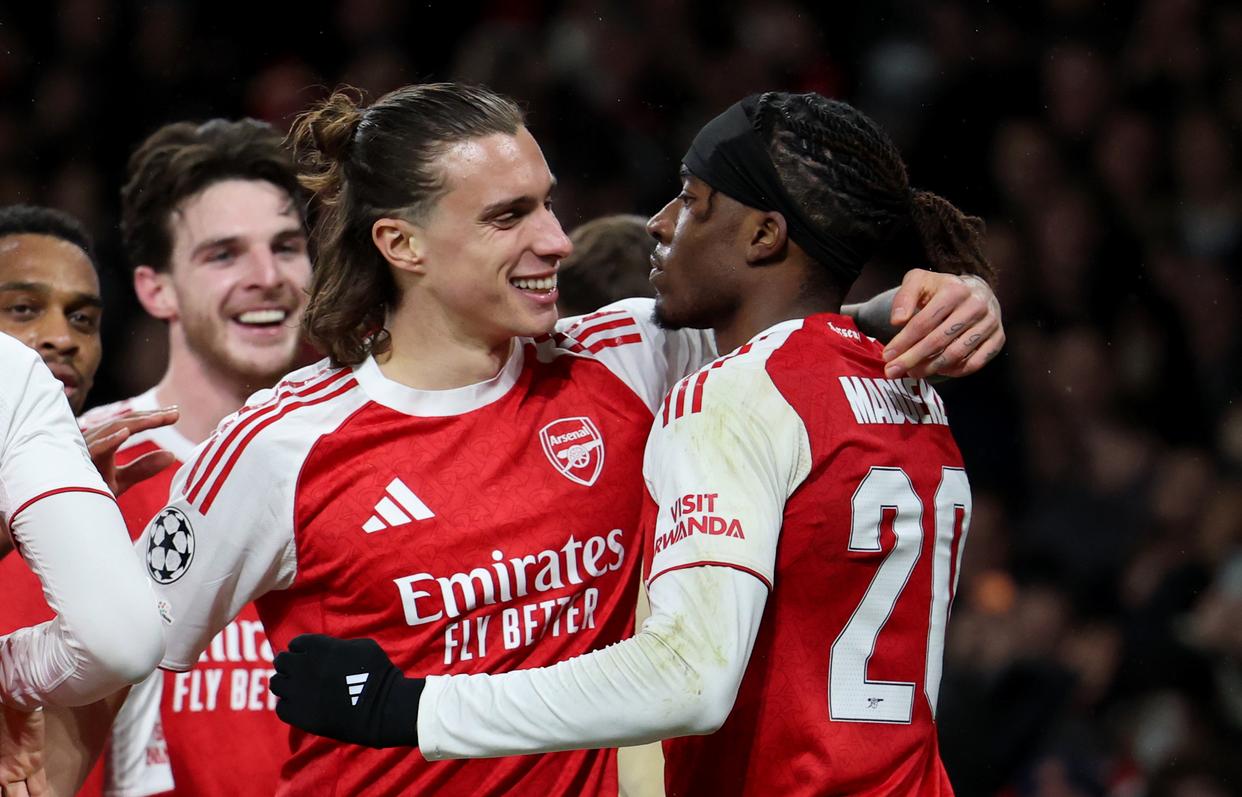 11月26日,阿森纳队球员马杜埃凯(右一)进球后与队友庆祝。新华社记者李颖摄