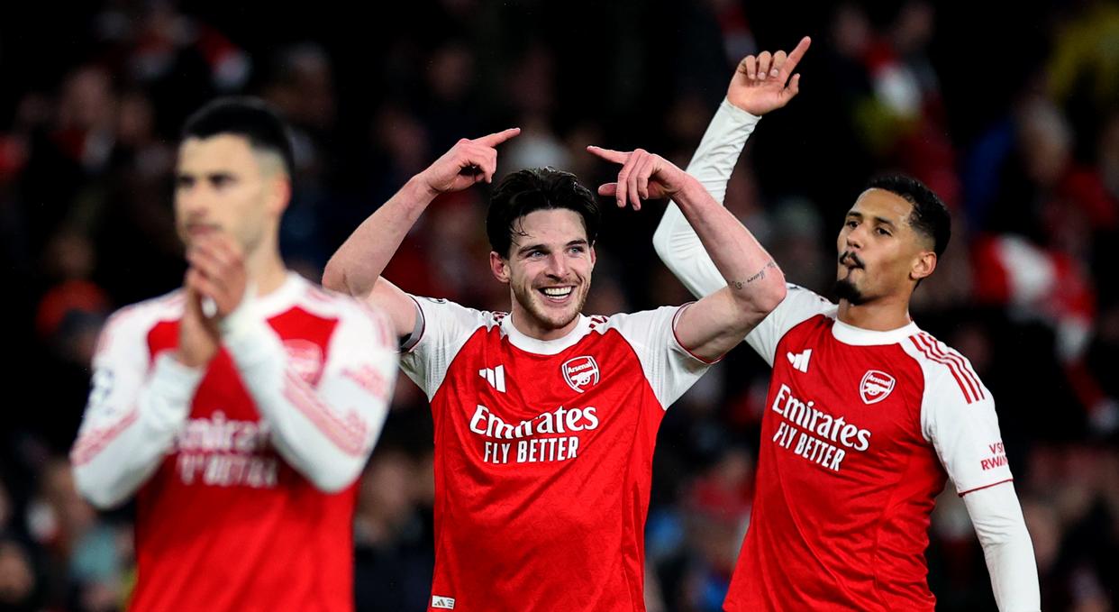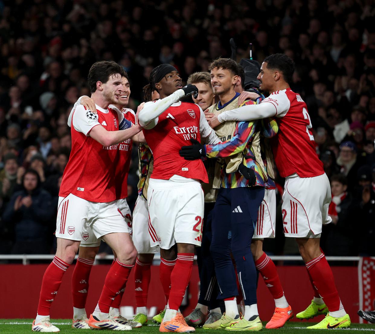 11月26日,阿森纳队球员赖斯(中)赛后庆祝胜利。新华社记者李颖摄