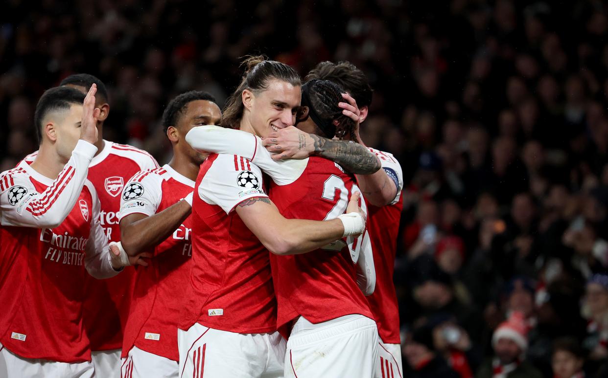 11月26日,阿森纳队球员庆祝进球。新华社记者李颖摄