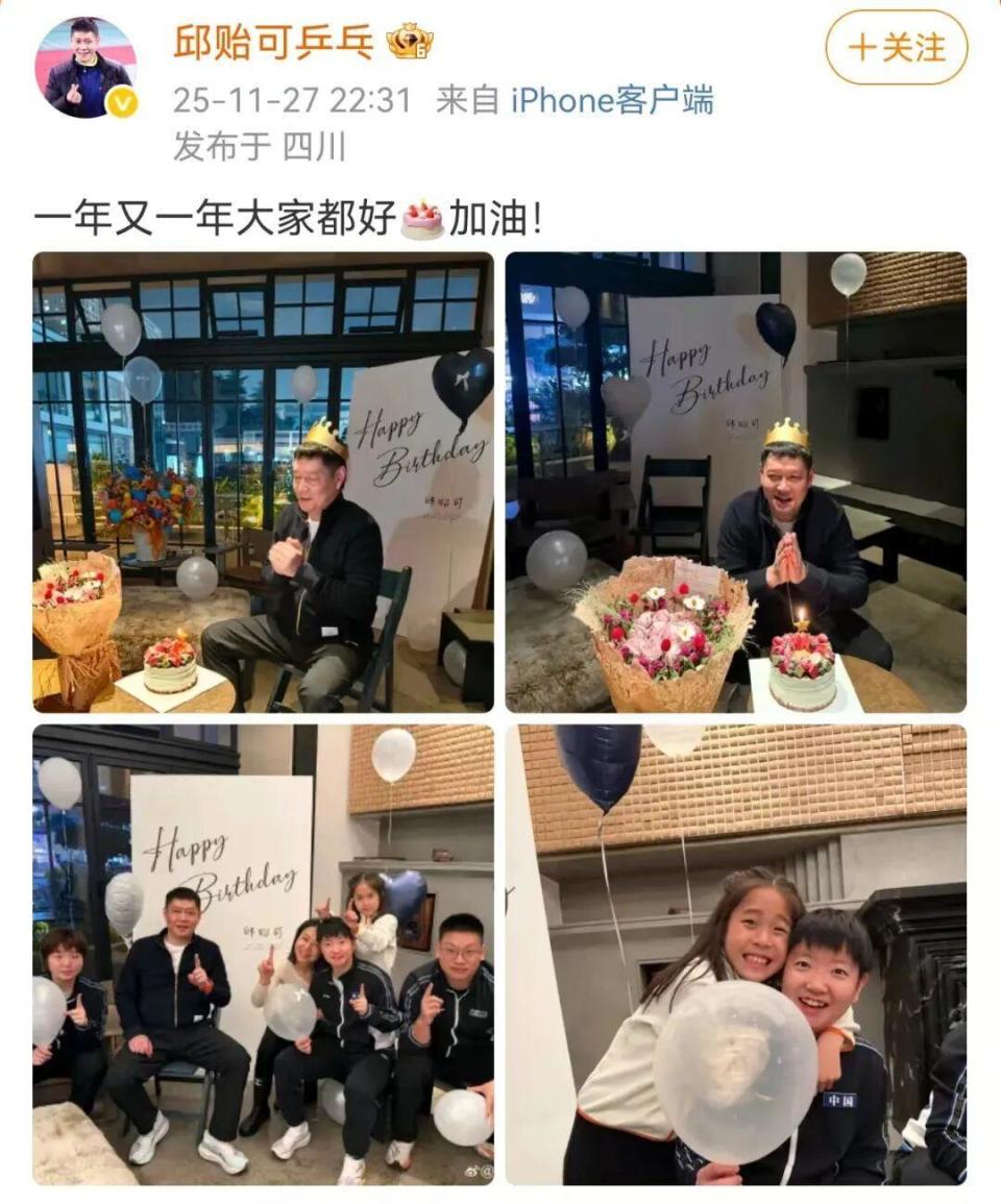 11月27日晚,国乒教练邱贻可在社交平台晒出40岁庆生照,并配文:一年又一年大家都好!加油!