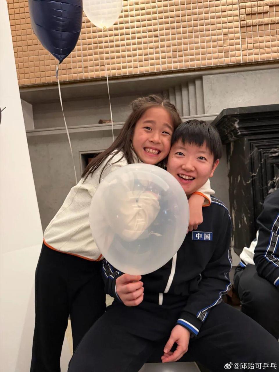 另一张照片中,邱贻可女儿小豌豆紧搂着孙颖莎,笑容灿烂。