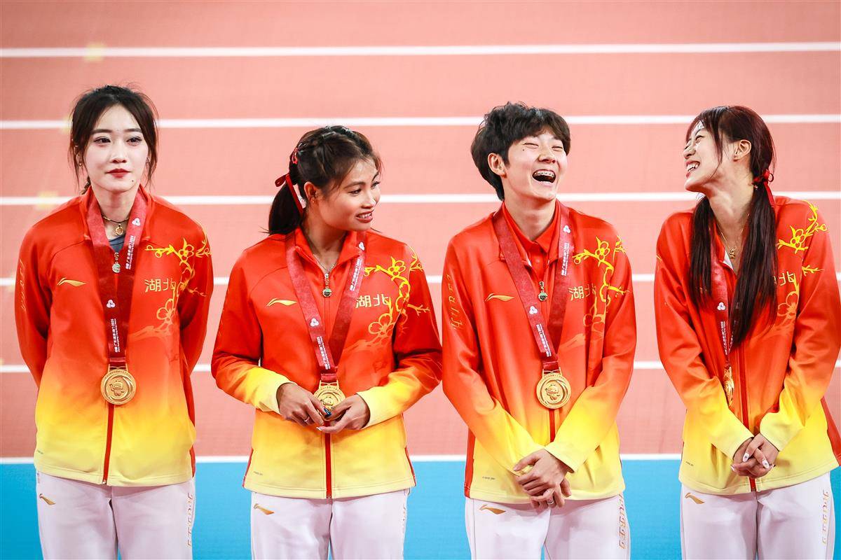 11月20日的女子4×100米接力决赛,湖北队以明显优势率先撞线,冠军!突破!