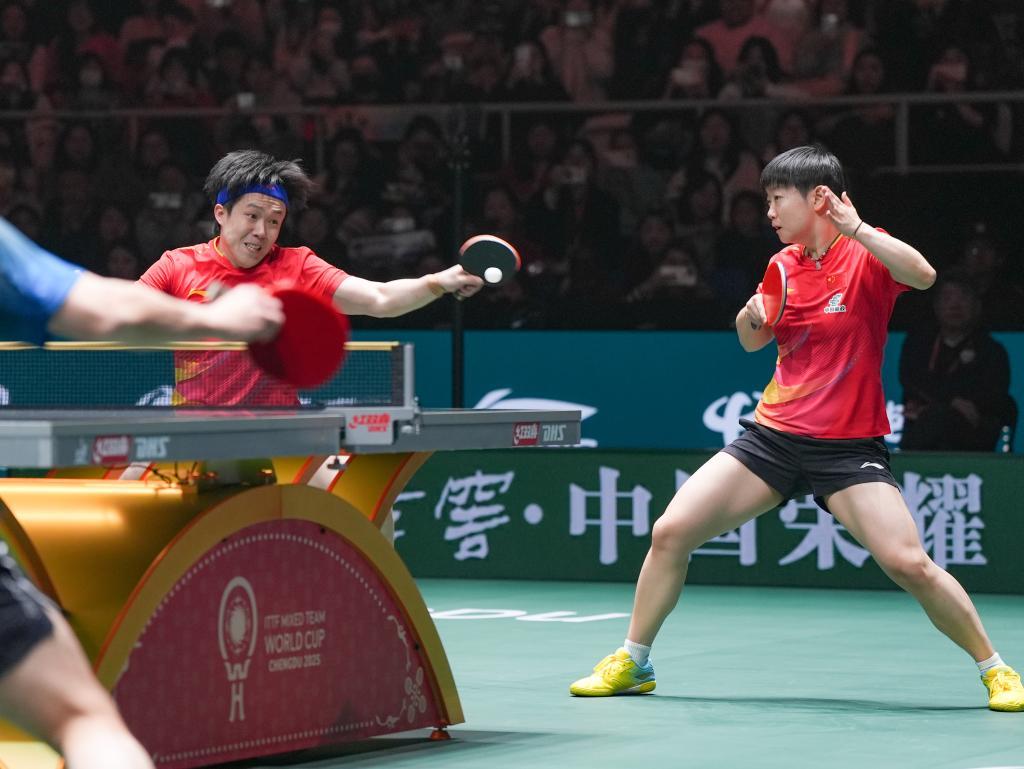 中国队在第一阶段与中国香港队、智利队、埃及队同组。揭幕战上对阵中国香港队,代表中国队首先登场的是王楚钦/孙颖莎,他们的混双对手是黄镇廷/杜凯琹。比赛一开始,黄镇廷/杜凯琹打得较为主动,取得了7:3的领先,不过王楚钦/孙颖莎迅速调整状态,稳扎稳打,以12:10逆转拿下首局。此后两局场面依旧胶着,但在关键球上王楚钦/孙颖莎处理得更为细腻,再下两局帮助中国队拿下3分。