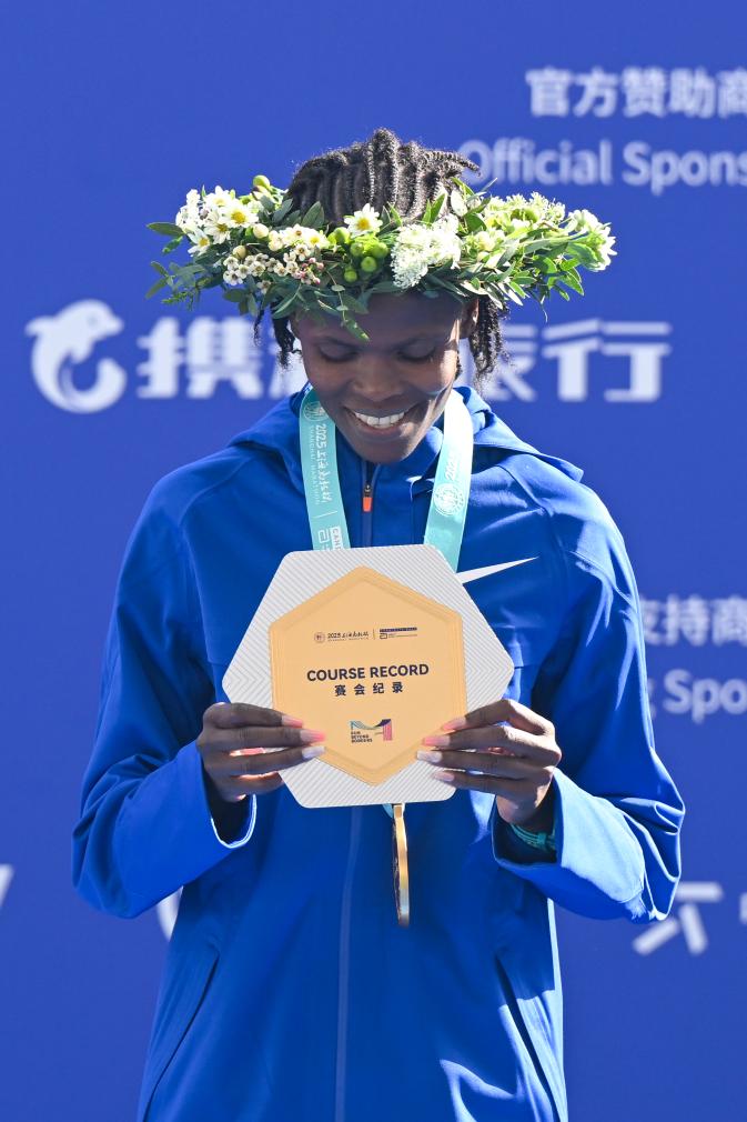 11月30日,女子组冠军肯尼亚选手布里吉德·科斯盖在颁奖仪式上。 新华社记者 陈浩明 摄