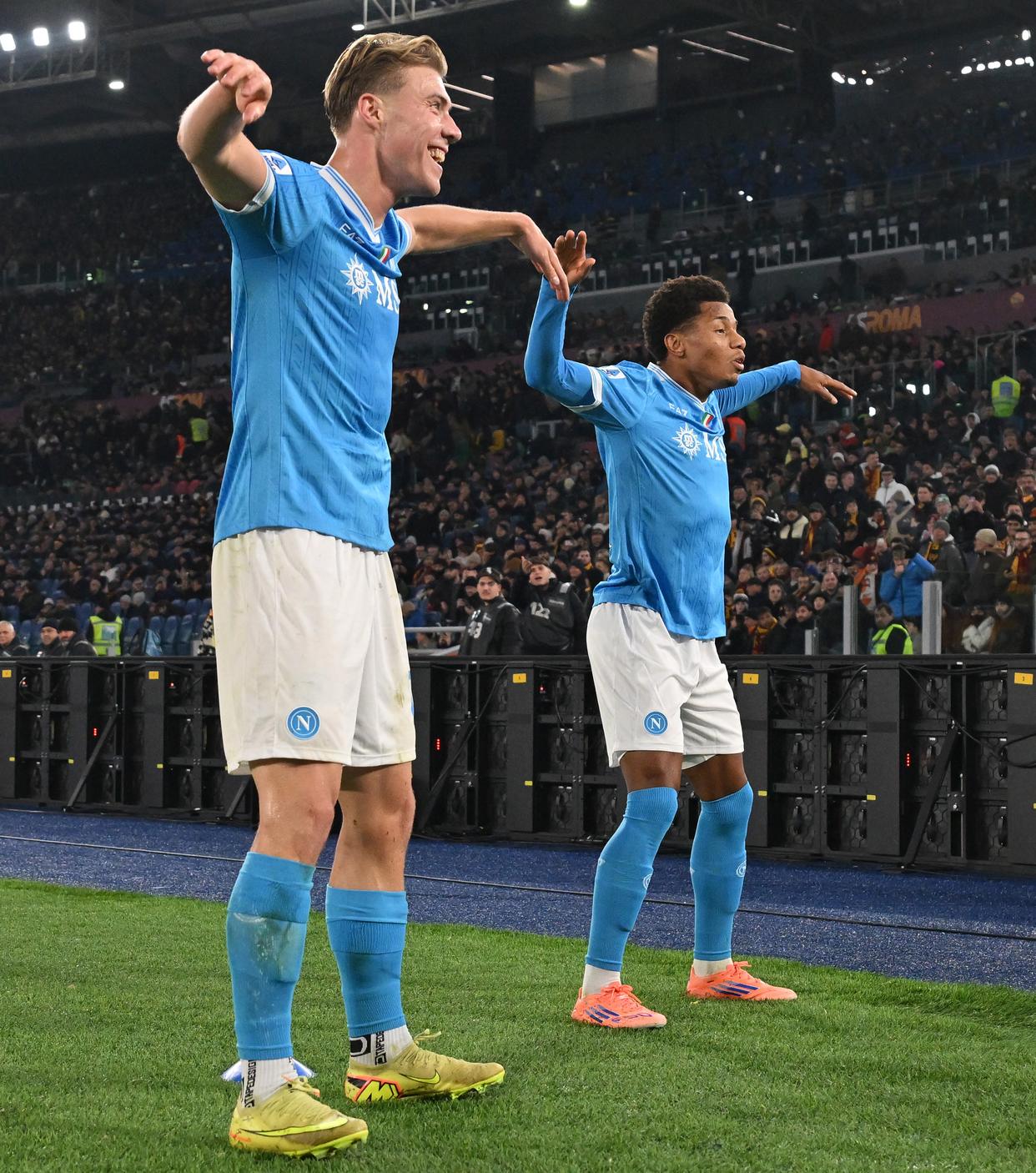 11月30日,那不勒斯队球员内雷斯(右)与队友霍伊伦在比赛中庆祝进球。新华社发(阿尔贝托·林格利亚摄) 在罗马对阵那不勒斯的比赛中,双方开局互有攻守,但客队的进攻更具威胁。第36分钟,那不勒斯利用一次快速反击打破僵局:内雷斯前场得球后长驱直入至禁区,面对门将斯维拉尔冷静低射得手。易边再战,罗马加强攻势,但始终难以改写比分。比赛尾声阶段,巴尔丹齐的抽射被那不勒斯门将米林科维奇·萨维奇奋力化解,最终罗马主场0:1落败。