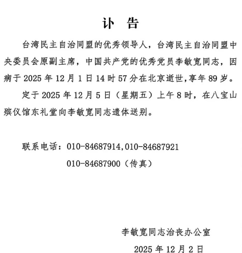 台湾民主自治同盟的优秀领导人,台湾民主自治同盟中央委员会原副主席,中国共产党的优秀党员李敏宽同志,因病于2025年12月1日14时57分在北京逝世,享年89岁。