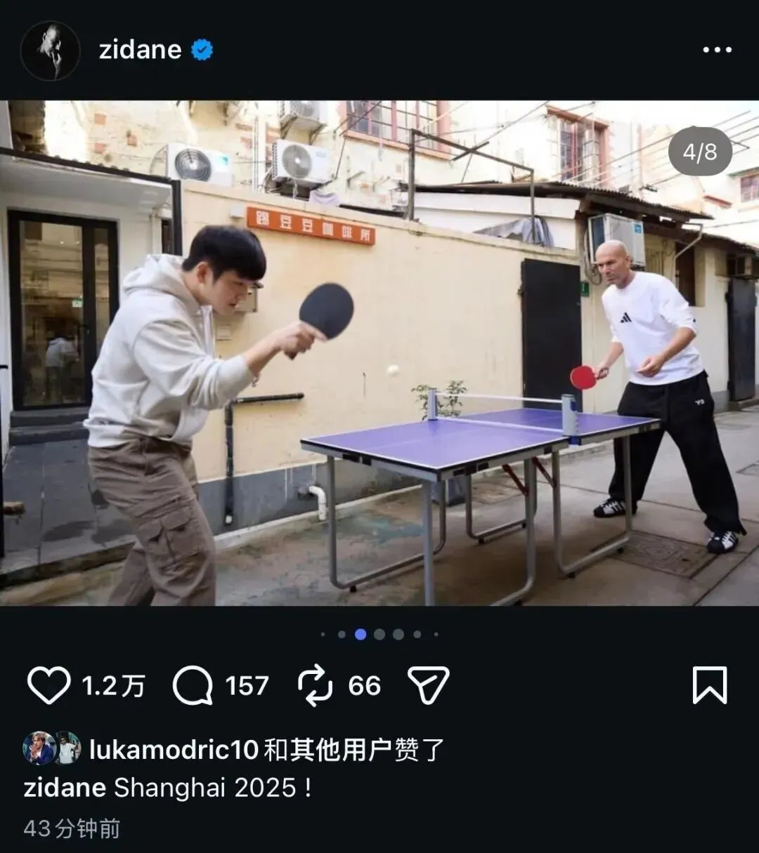 12月5日,齐达内在个人社交媒体分享了8张上海之行的照片,其中有一张照片是和樊振东打乒乓球。