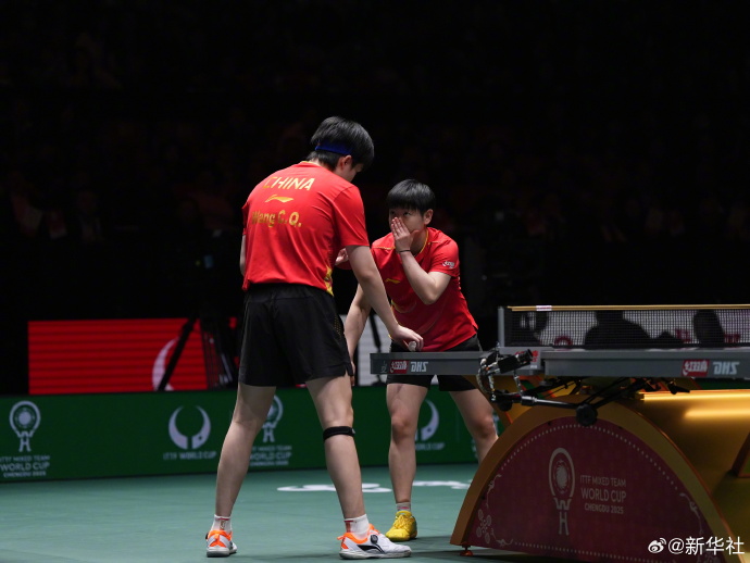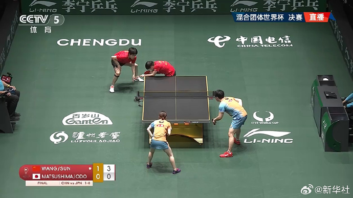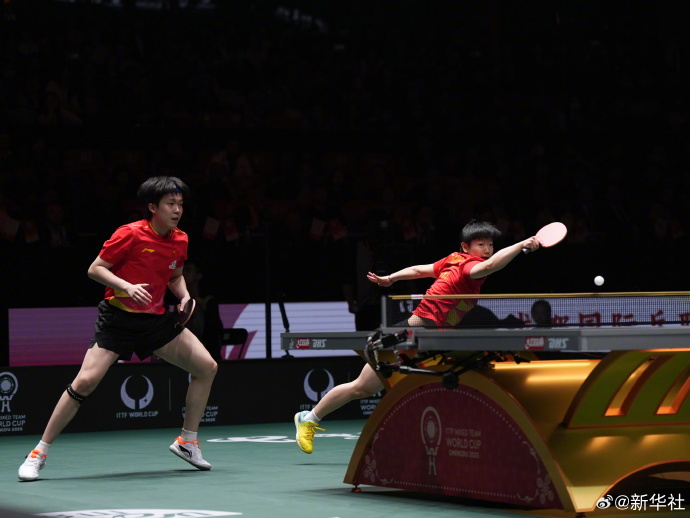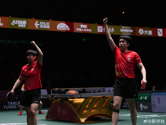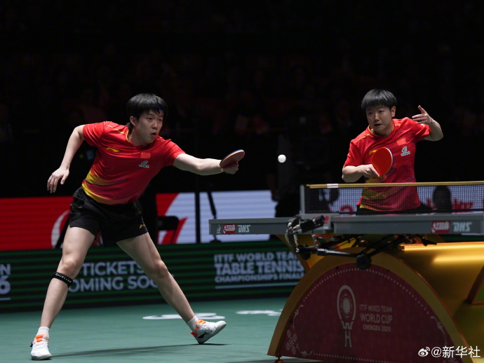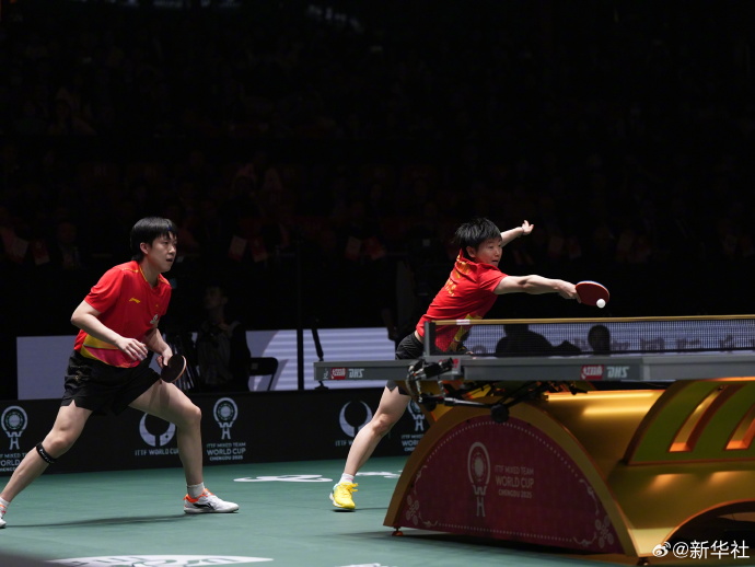 12月7日晚,2025国际乒联混合团体世界杯决赛,中国队迎战日本队。在第一盘混双比赛中,王楚钦和孙颖莎3比0日本选手松岛辉空、大藤沙月,比赛还在继续。(记者:陈地 王曦 胥冰洁)