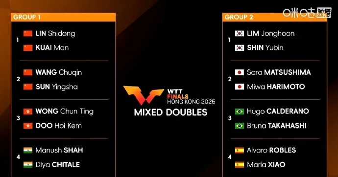 混双第一阶段分组确定,国乒两对组合林诗栋/蒯曼、王楚钦/孙颖莎同组。【Group 1】林诗栋/蒯曼、王楚钦/孙颖莎、黄镇廷/杜凯琹、玛纳什·沙/奇塔莱【Group 2】林钟勋/申裕斌、松岛辉空/张本美和、卡尔德拉诺/高桥·布鲁娜、罗伯勒斯/肖瑶茜