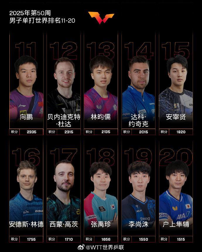 12月9日,国际乒联公布2025年第50周世界排名。