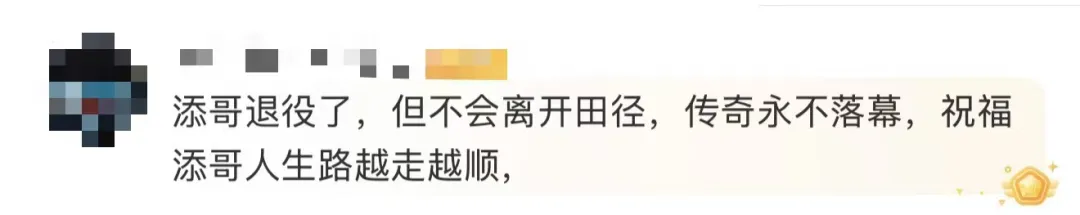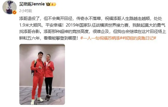 田径运动员吴艳妮发文祝福:添哥退役了,但不会离开田径,传奇永不落幕,祝福添哥人生路越走越顺,处处1.9米大顺风,平安幸福!2019年国家队征战横滨世界接力赛,我鼓起莫大的勇气找添哥合影。添哥那种超神的竞技高度,很难企及,但我也会继续在这片田径场上耕耘五六年,看看能攀登到哪里!