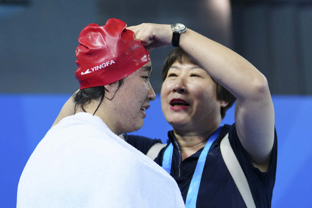 12月13日,教练在女子16-21岁组200米自由泳决赛第3组比赛结束后帮助云南队选手马晨曦(左)摘泳帽。她获得该组别季军。新华社记者 齐芷玥 摄