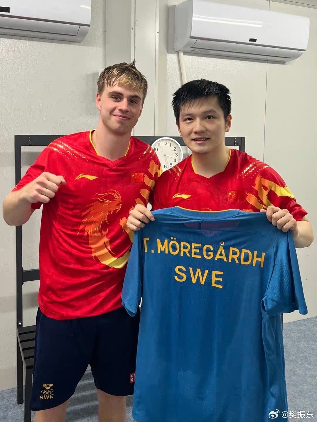 2024年,巴黎奥运会乒乓球男单决赛,樊振东4比1战胜莫雷加德夺金,两人赛后相拥并交换球衣。后来樊振东宣布加盟德甲,与莫雷加德成为队友,莫雷加德曾在社交媒体表达对樊振东的欢迎。