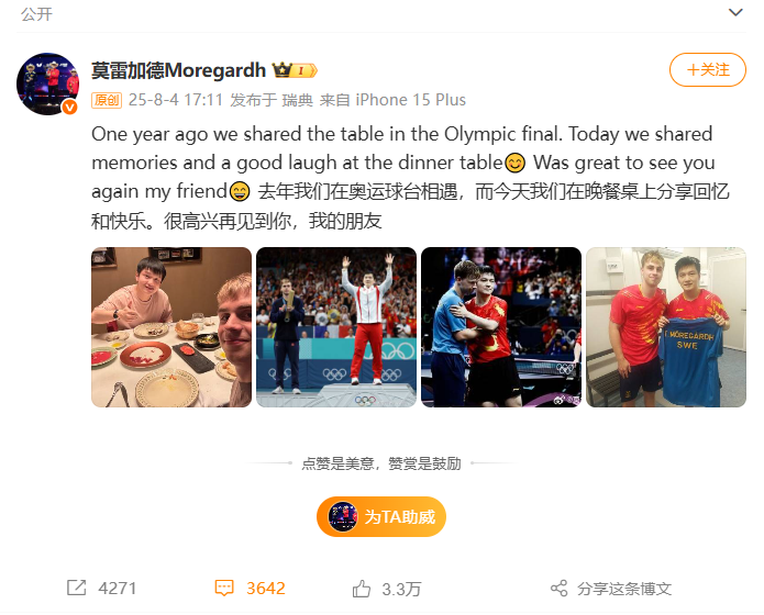 今年8月,莫雷加德曾在社交平台分享和樊振东聚餐的照片并配文:去年我们在奥运球台相遇,而今天我们在晚餐桌上分享回忆和快乐。很高兴再见到你,我的朋友。