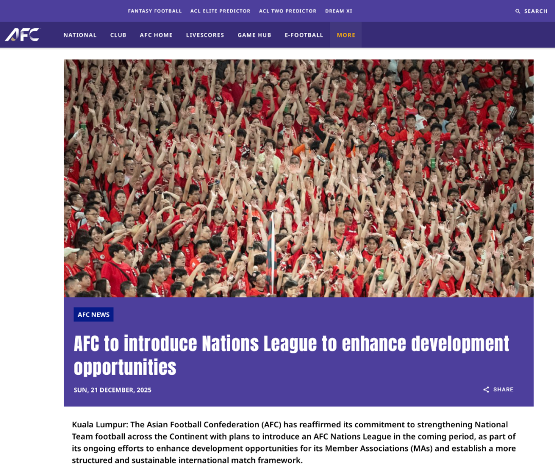 12月21日,亚足联发布官方公告,宣布计划在近期推出亚足联国家联赛,旨在确保在国际比赛窗口期间,能够定期举办有意义的国际足球赛事。