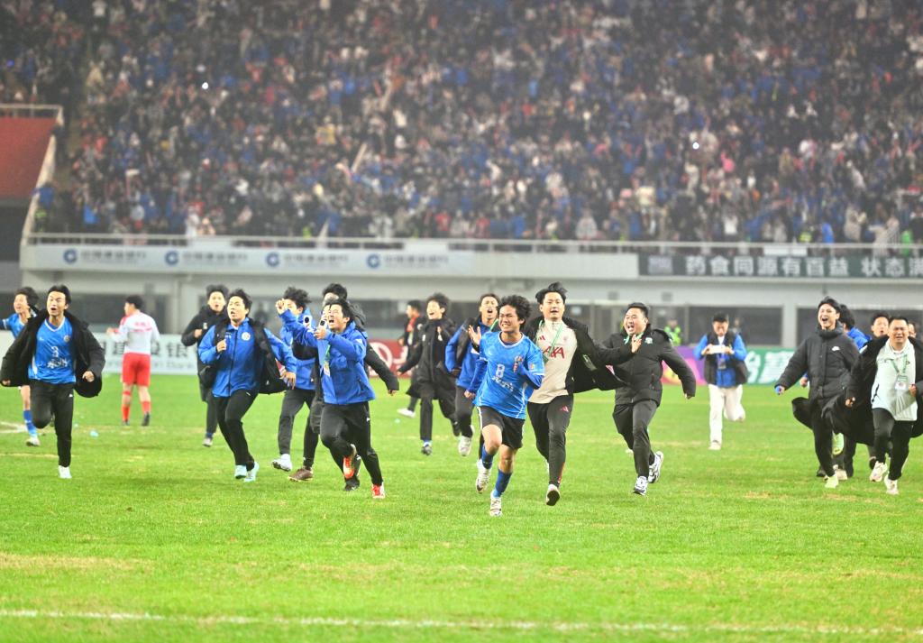 12月21日,在2025湖南省足球联赛半决赛后,常德队庆祝胜利。 郭立亮 摄