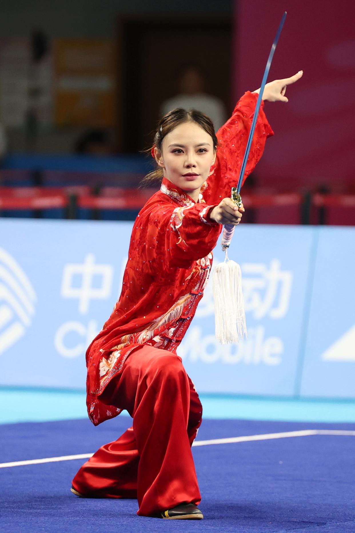 ↑8月8日,卢卓灵在太极剑比赛中。当日,在成都世运会武术项目女子太极拳-太极剑决赛中,中国选手卢卓灵夺得冠军。这是中国体育代表团在成都世运会上的首枚金牌。新华社记者 徐速绘 摄