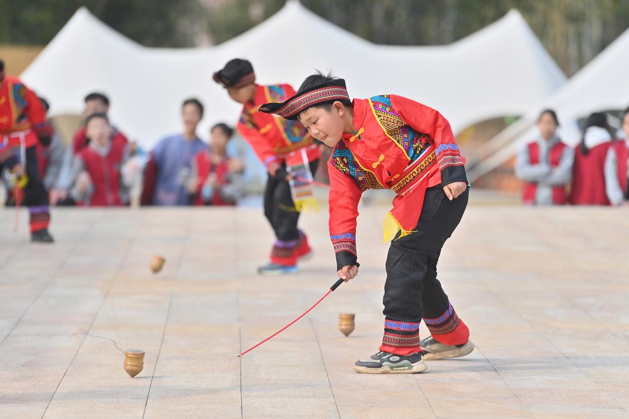 ↑2月20日,在广西梧州市长洲区倒水镇富万村金桂广场,富万小学的学生在打陀螺。 新华社记者 黄孝邦 摄