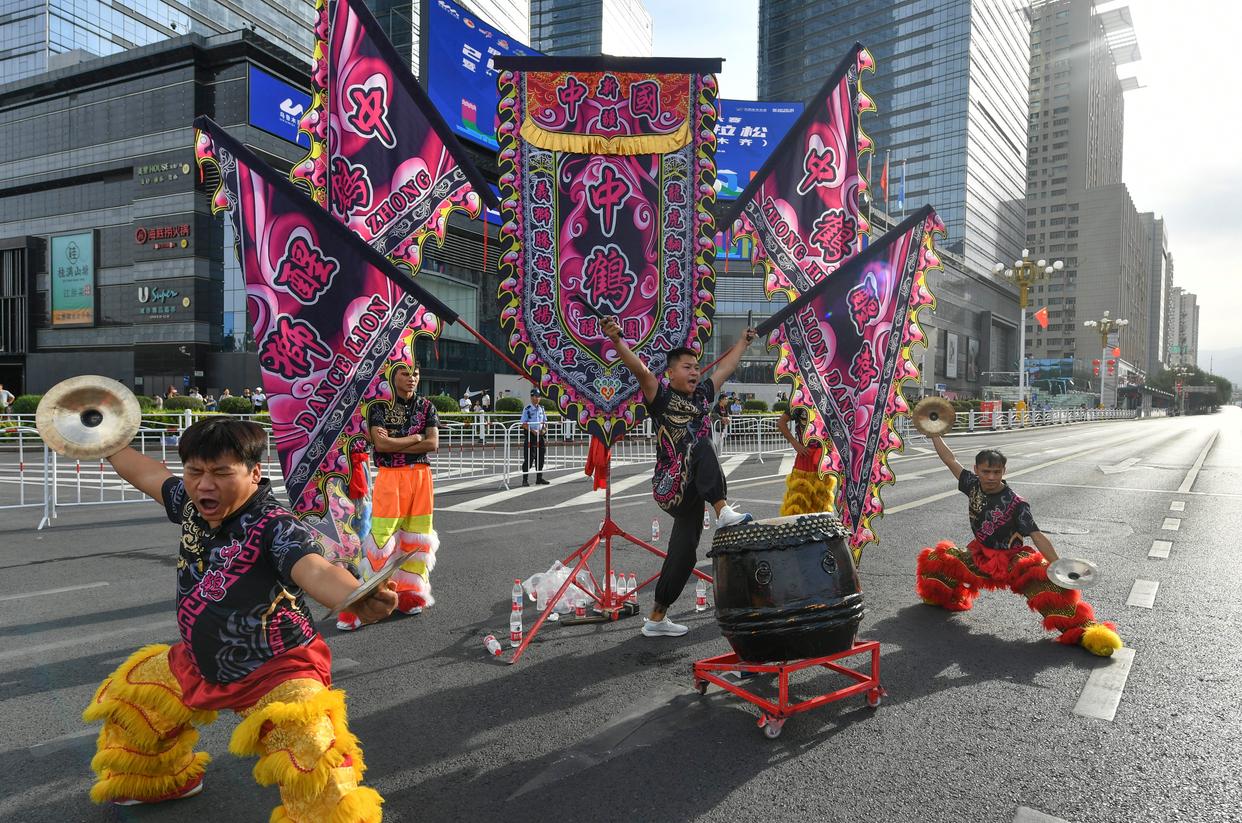 ↑8月31日,舞狮队演员在比赛中为参赛选手呐喊助威。当日,2025乌鲁木齐马拉松暨“跑遍大美新疆”(乌鲁木齐)赛事在新疆国际会展中心鸣枪开跑。新华社记者 王菲 摄