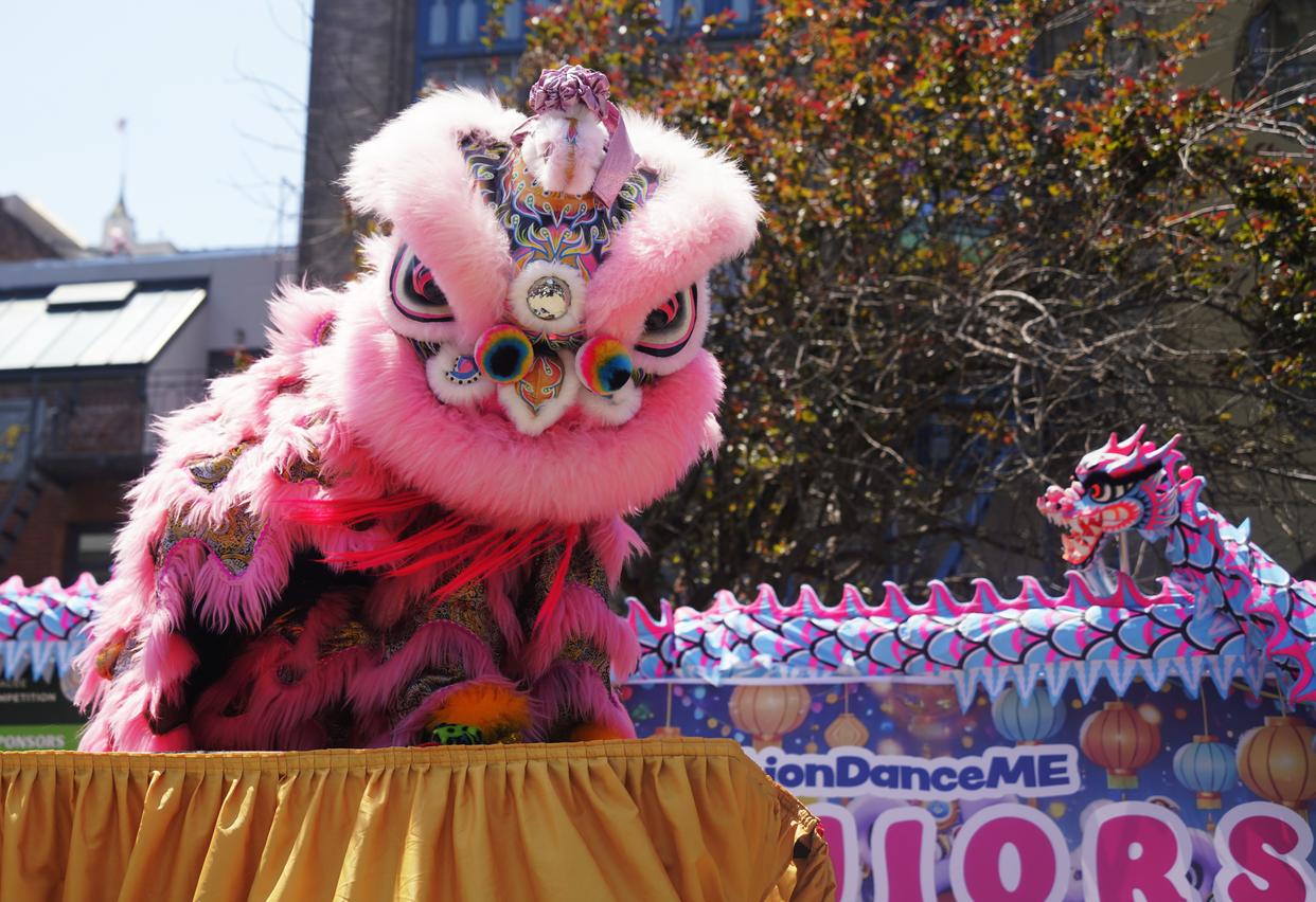 ↑5月17日,在美国旧金山唐人街,一个少年舞狮团在第四届旧金山舞狮舞龙公开赛颁奖典礼上进行舞狮表演。新华社记者 吴晓凌 摄