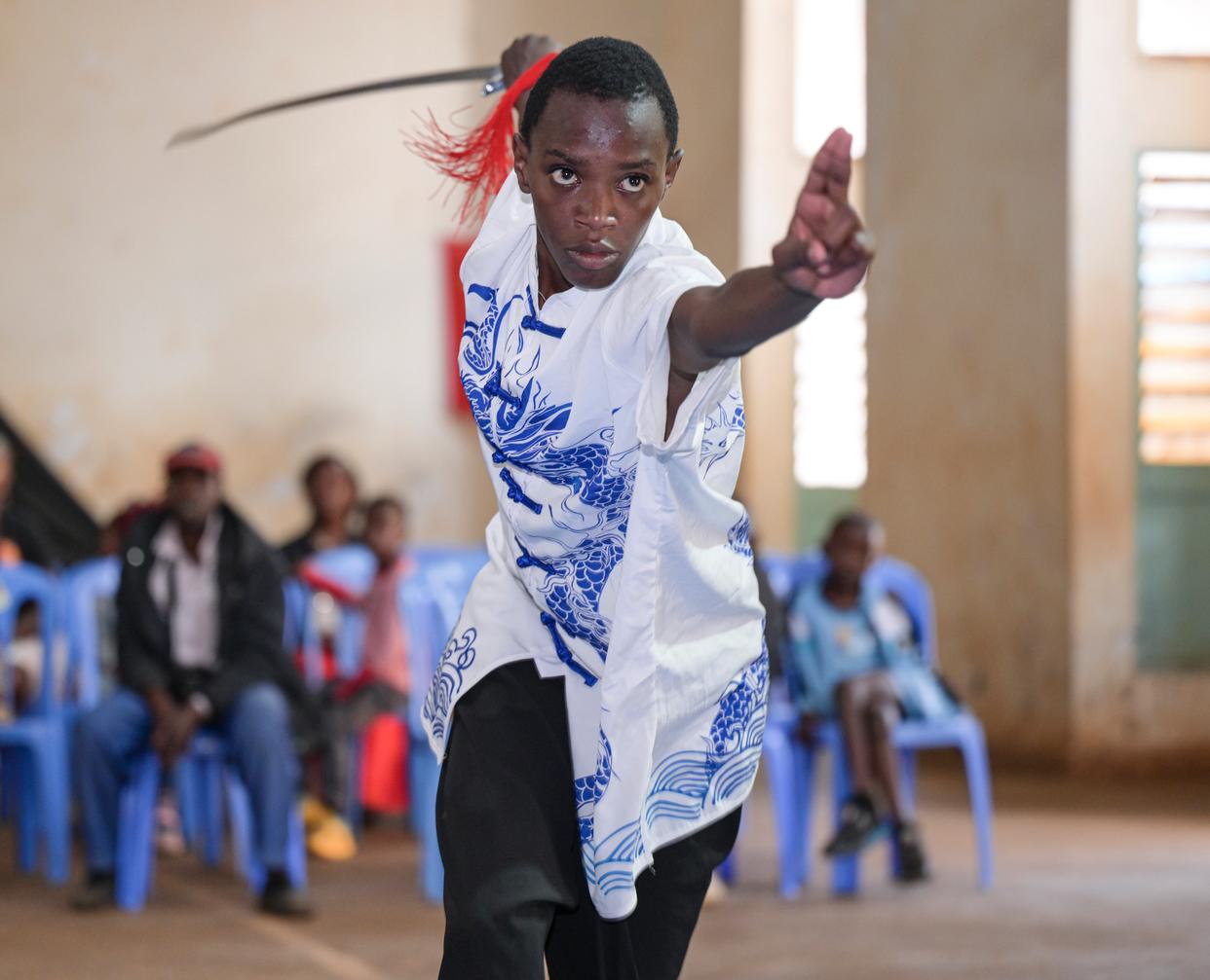 ↑11月29日,在肯尼亚中部基安布郡,一名选手在比赛中。当日,肯尼亚第四届功夫武术锦标赛在肯尼亚基安布郡举行,来自肯尼亚7家俱乐部的35名选手向观众展示中国功夫的魅力,比赛项目包括刀术、棍术、散打等多个类别。新华社记者 杨光 摄