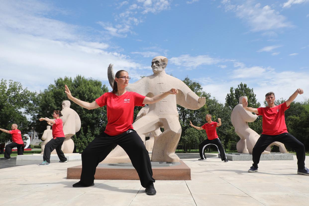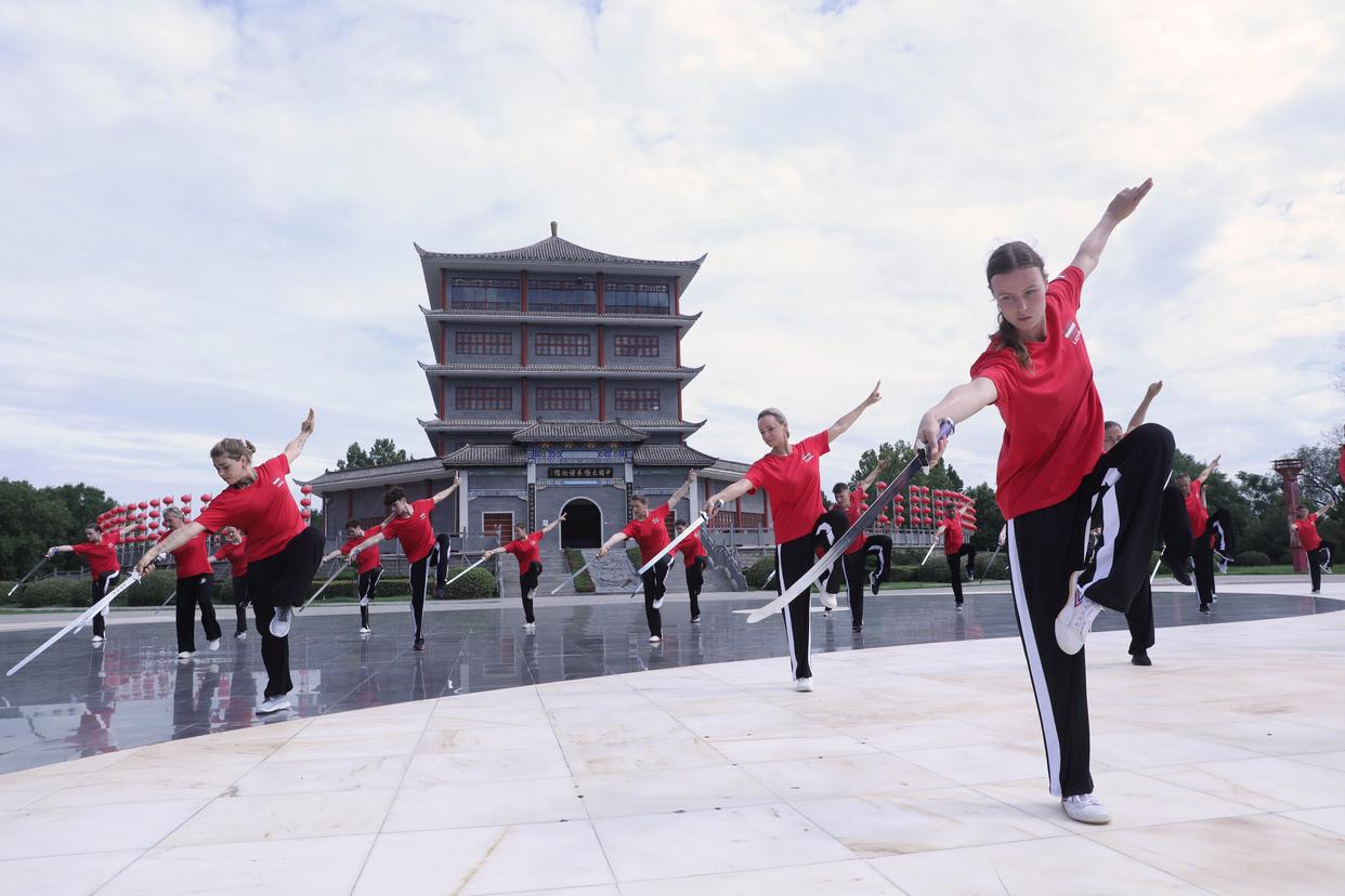 ↑8月16日,在河南省焦作市温县陈家沟,拉脱维亚学员在练习太极拳。近日,来自拉脱维亚的29名学员来到太极拳的发源地河南省焦作市温县陈家沟,开展为期15天的集训交流活动,体验陈式太极拳的独特魅力,感受中国武术文化的博大精深。新华社发(徐宏星摄)