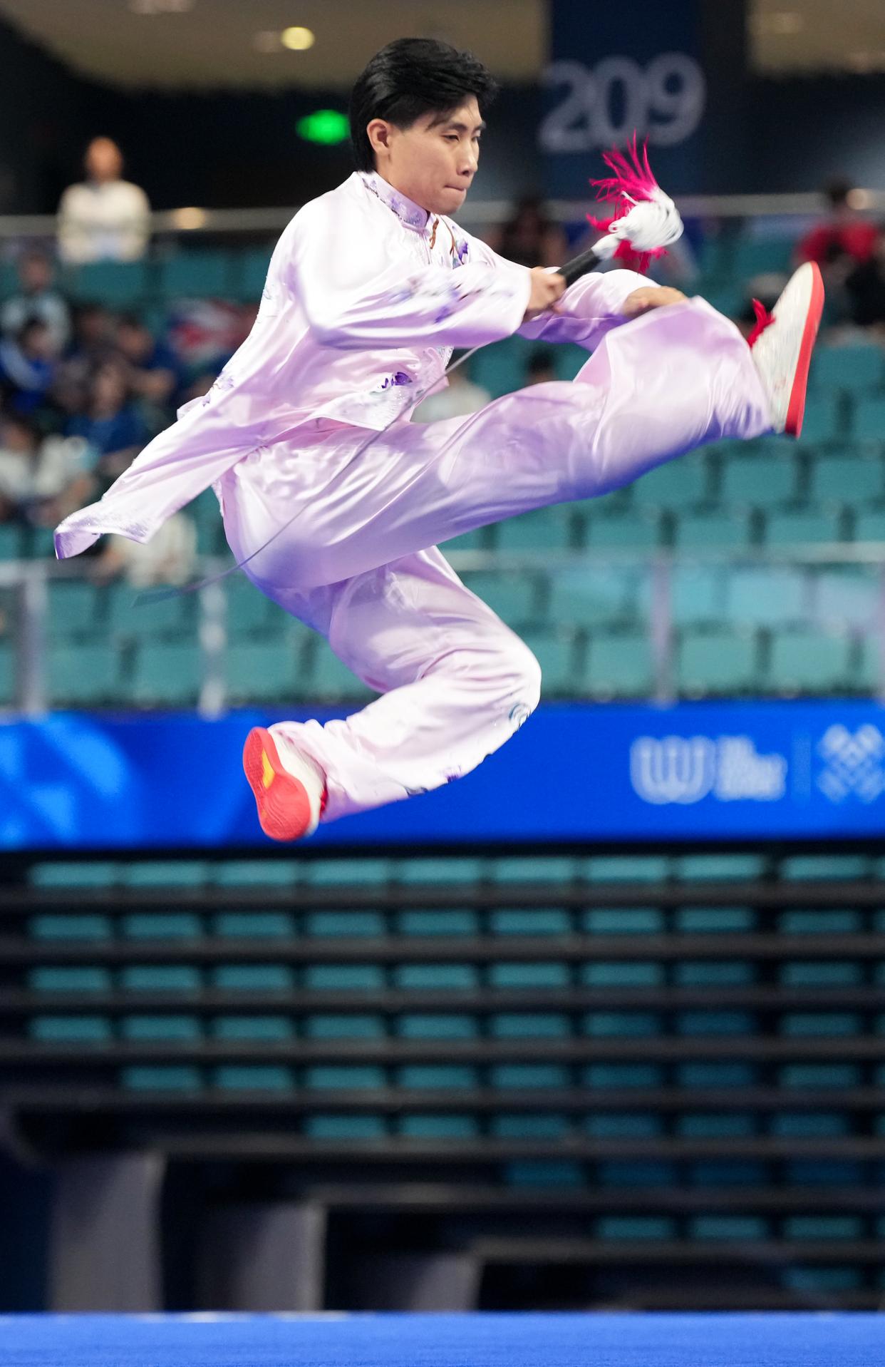 ↑8月9日,新加坡选手郑宇轩在2025年成都世运会男子太极拳-太极剑决赛太极剑比赛中。新华社记者 徐速绘 摄全运盛会,传统绽芳