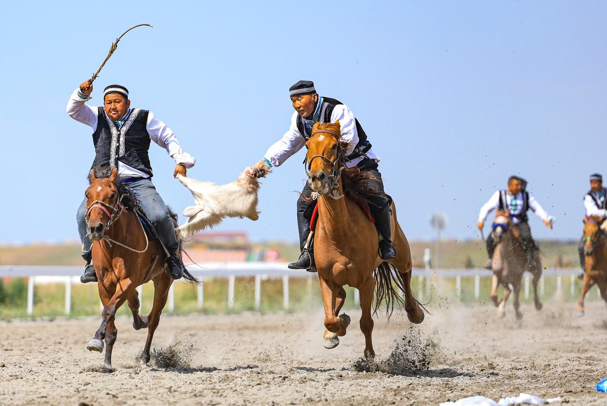 7月19日,演员们在新疆昭苏举行的2025新疆伊犁天马文化旅游节开幕式上进行“叼羊”表演。当日,2025新疆伊犁天马文化旅游节在昭苏县天马文化园启幕,马术表演、民族传统体育赛事与民俗艺术展演等活动精彩纷呈。新华社记者 王菲 摄