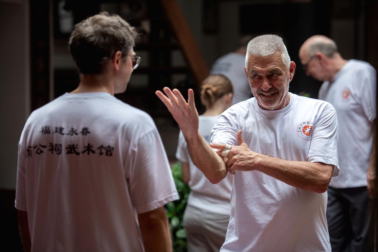 ↑10月17日,在福建省泉州市永春县五里街镇翁公祠武术馆,来自德国的永春白鹤拳弟子习练永春白鹤拳。连日来,来自德国的11名永春白鹤拳弟子,不远万里,到福建省泉州市永春县五里街镇翁公祠武术馆溯源寻根,习练永春白鹤拳。新华社发 (康庆平 摄)