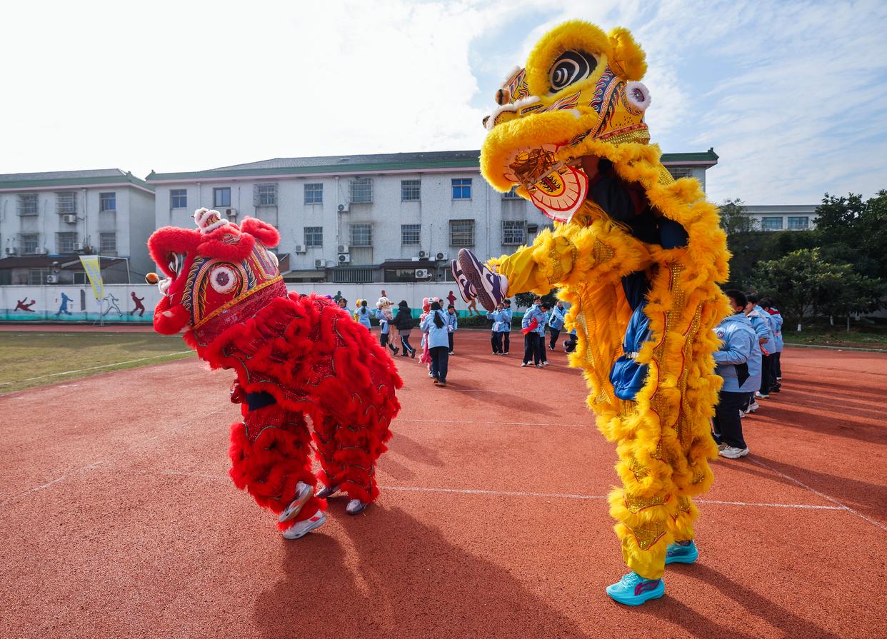 ↑12月16日,浙江省湖州市织里镇轧村中学的学生们在阳光大课间活动中进行舞狮训练。新华社记者 徐昱 摄