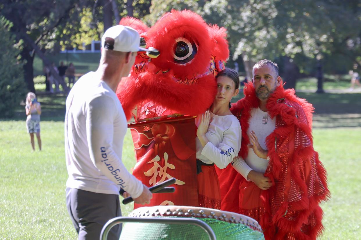 ↑9月21日,在匈牙利首都布达佩斯,匈牙利舞狮协会主席、禅武联盟副主席桑多尔·米凯斯(左)指导舞狮表演,16岁的高中女生劳拉·萨拉蒙(中)和搭档认真聆听。新华社发(弗尔季·奥蒂洛摄)传承不泥古、创新不离宗