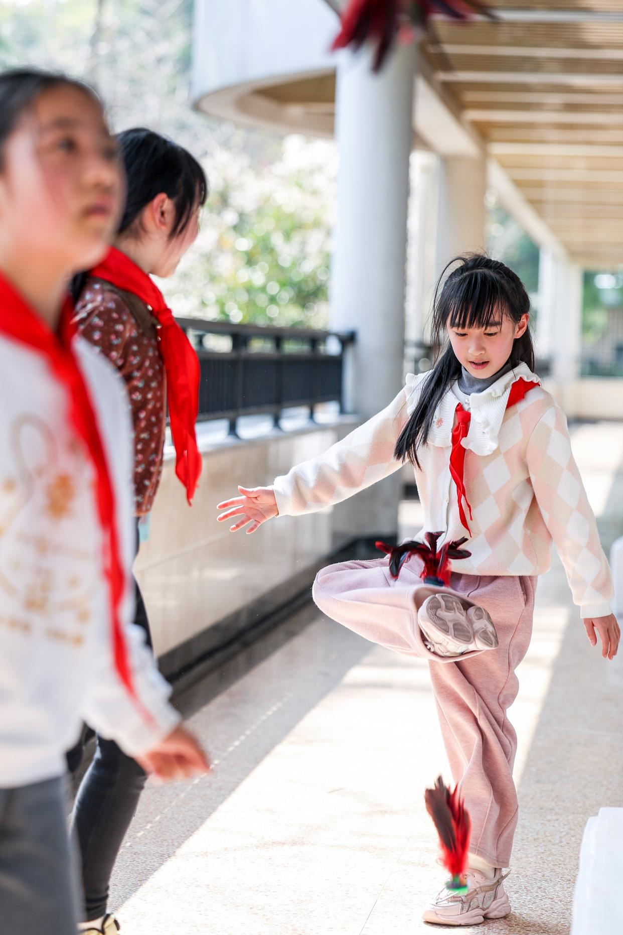 ↑3月11日,浙江省杭州市京都小学学生课间在走廊上踢毽子。新华社记者 江汉 摄
