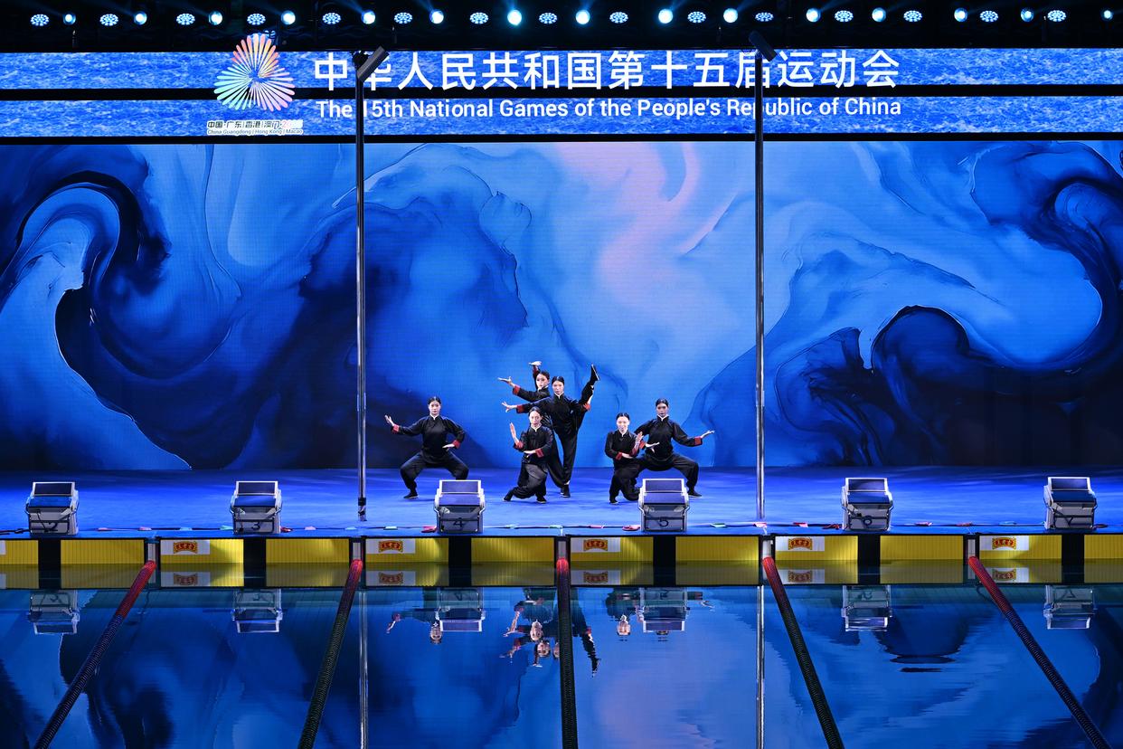 ↑11月15日,演员在第十五届全国运动会游泳女子100米自由泳决赛开始前表演。新华社记者 陈益宸 摄跨界融合,文旅焕新