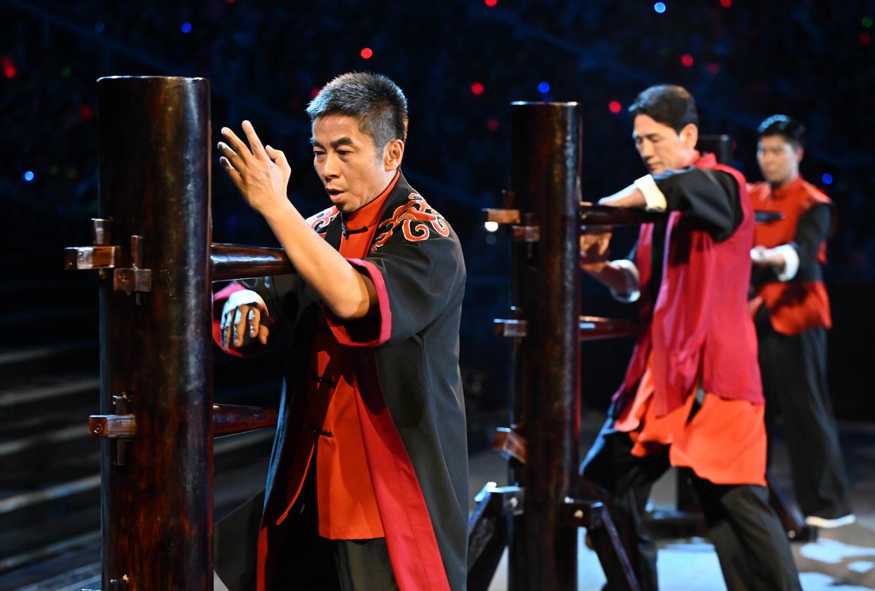 ↑11月9日,演员在第十五届全国运动会开幕式现场展示咏春拳。新华社记者 肖艺九 摄