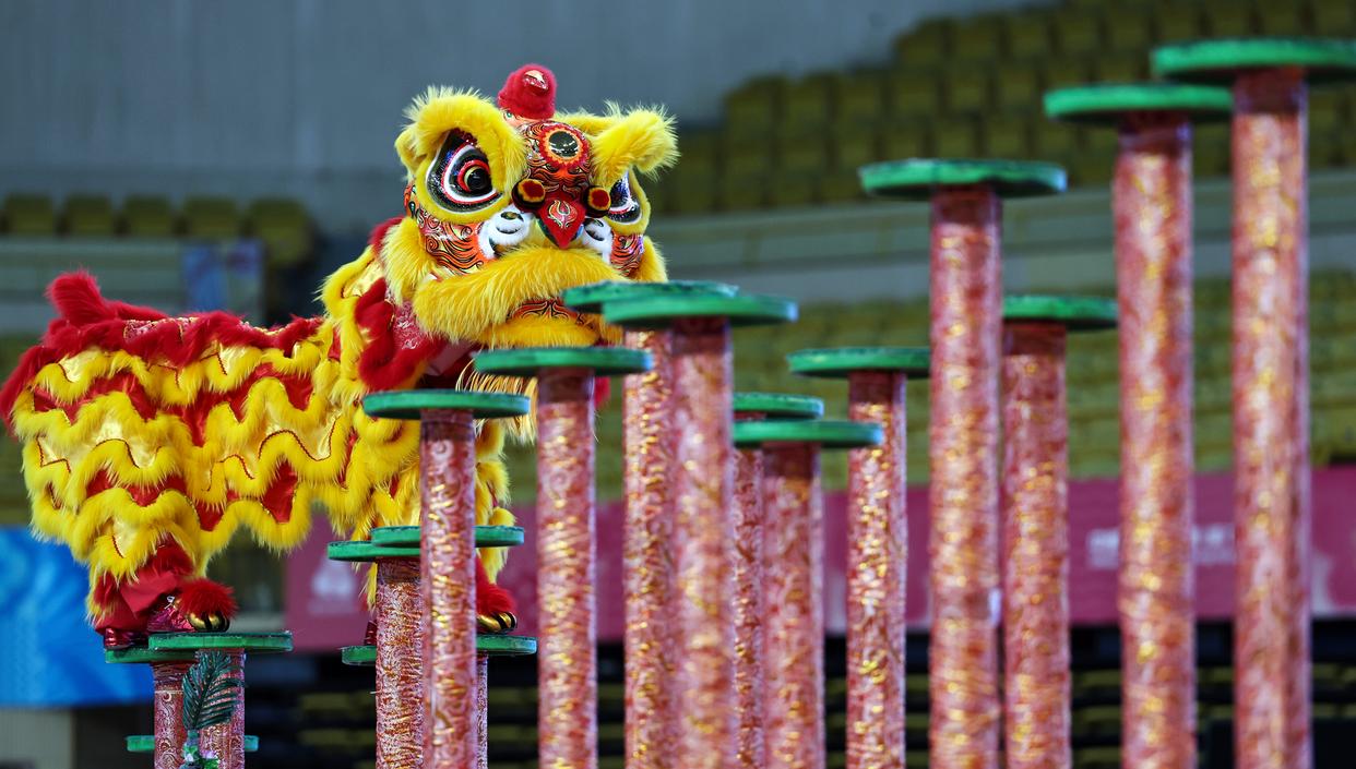 ↑5月24日,江西队在舞龙障碍预赛中。当日,第十五届运动会群众展演舞龙舞狮项目预赛在江苏省扬州市江都区开赛。新华社发(任飞摄)