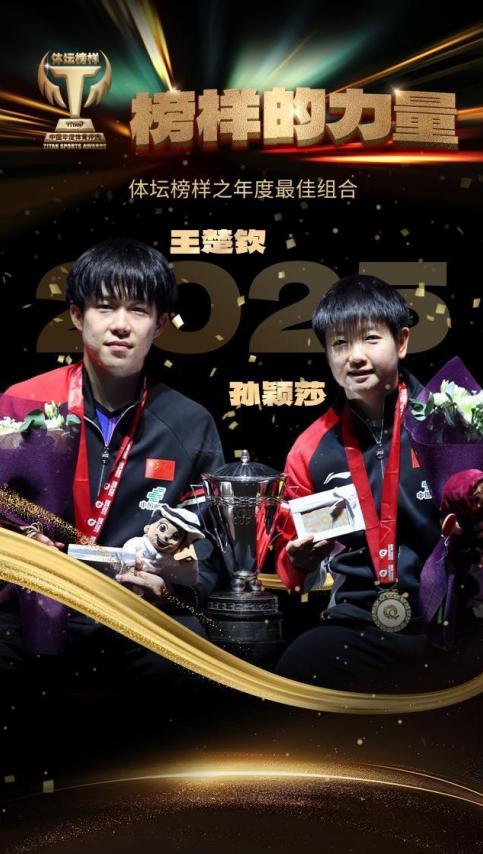 12月初,王楚钦、孙颖莎领衔的国乒在2025年成都混合团体世界杯上以全胜战绩勇夺桂冠,在成都实现该项赛事的三连冠!12月29日中午,又传来一条喜讯——在第十六届体坛榜样年度评选中,王楚钦和孙颖莎分获年度最佳男、女运动员,并携手夺得年度最佳组合奖!