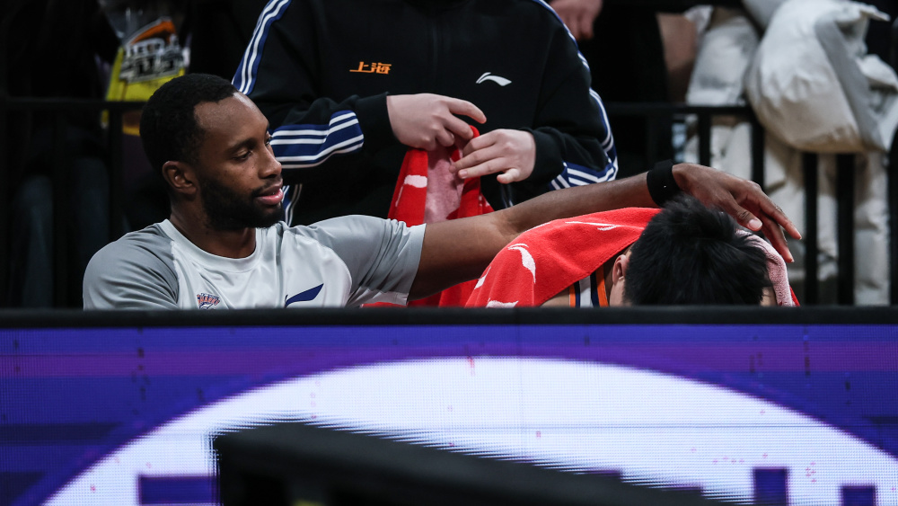 12月31日,赛前辽宁本钢队现场播放关于张镇麟和弗格的回顾视频,张镇麟(右)观看时落泪。上海久事队球员弗格在一旁安慰。新华社记者 潘昱龙 摄
