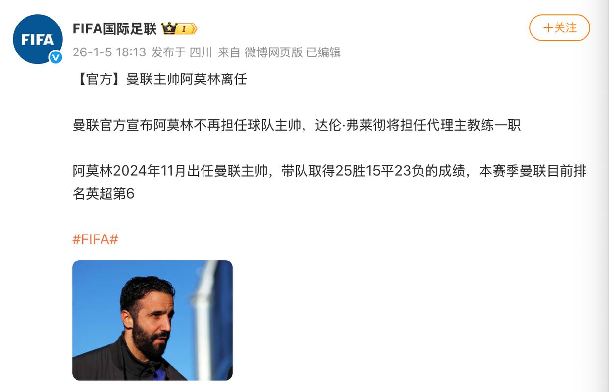 1月5日,据@FIFA国际足联 :曼联主帅阿莫林离任。阿莫林于2024年11月出任曼联主帅,带队取得25胜15平23负的成绩,本赛季曼联目前排名英超第6。据统计,阿莫林带队一年胜率不足40%。