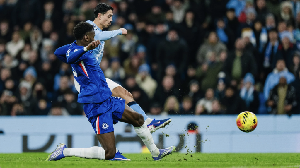 这是4日在曼城主场进行的一场英超第20轮焦点战。在马雷斯卡被解雇之后,切尔西U21梯队教练卡勒姆·麦克法兰临时接管一线队。面对曼城,切尔西采取低位防守,成功限制了对手的进攻效率。直到第37分钟,曼城才迎来第一脚有威胁的射门——哈兰德的射门打到切尔西球员身上后发生折射,被对方门将约根森扑出。1分钟后,这位挪威射手再次获得射门机会,击中门柱弹出。第42分钟时,曼城终于破门:中场球员赖因德斯在禁区弧顶附近晃过切尔西防守球员后,一脚劲射将球送入球门左侧近角。