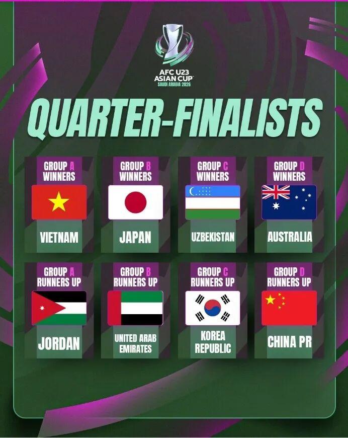 淘汰赛名单上,D组澳大利亚队2胜1负积6分获得小组第一,中国队1胜2平积5分排名第二;A组越南队三场全胜积9分排名小组第一,约旦队积6分排名第二;B组日本队三战全胜进10球失0球名列榜首,阿联酋队积4分排名第二;C组乌兹别克斯坦队2胜1平积7分排名第一,韩国队积4分排名第二。