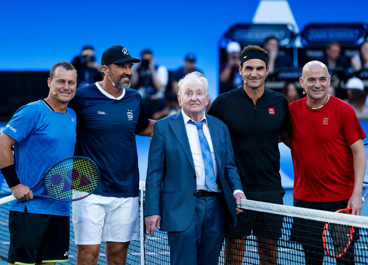 1月17日,休伊特、拉夫特、罗德·拉沃尔、费德勒、阿加西(从左到右)在表演赛前合影。新华社记者 马平 摄