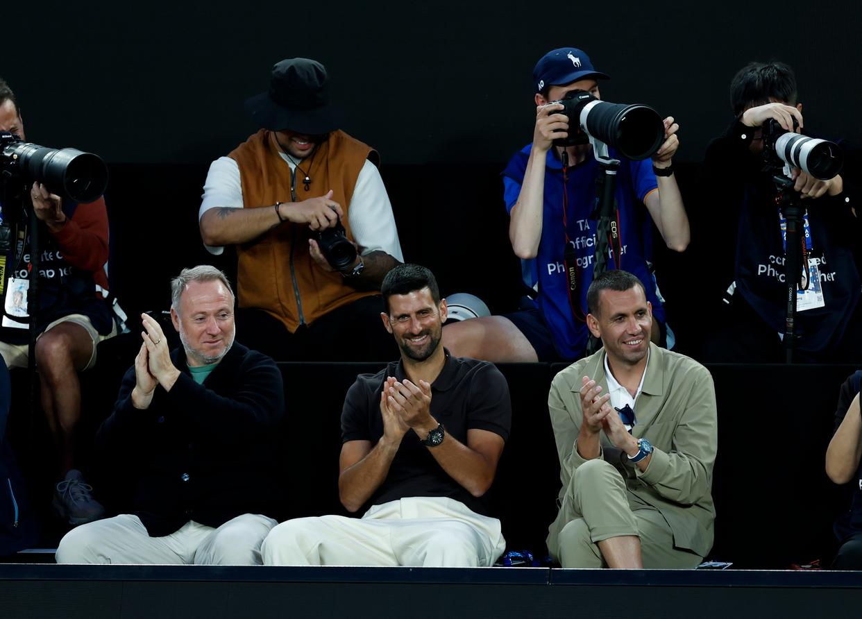 1月17日,塞尔维亚选手焦科维奇(前中)观看表演赛。新华社记者 马平 摄